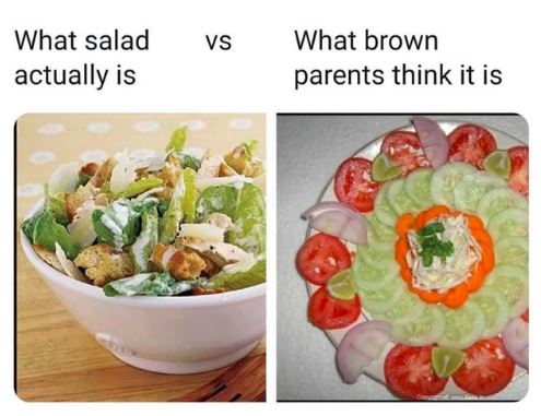 “What salad actually is” was apparently defined by “western cultures”. Any other culture that served up cucumbers, tomatoes, onions and didn’t do it in the same way as the western method was doing it “wrong”. The graphic should say “Caesar salad” (incidentally “invented” in Mexico) and “Indian salad”. They’re both valid salads! No culture should get a monopoly on how food can be prepared or served!